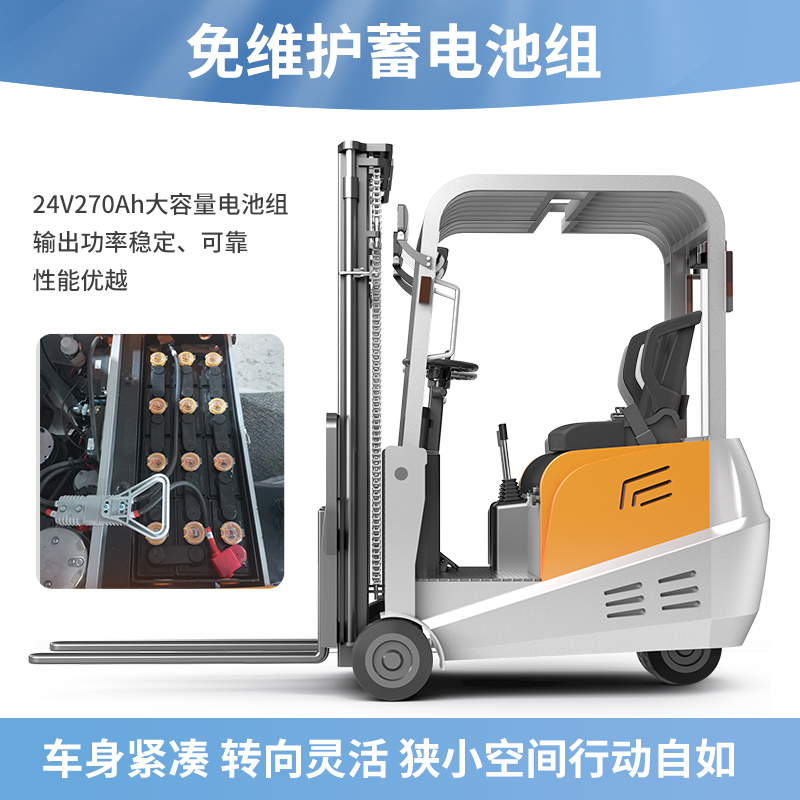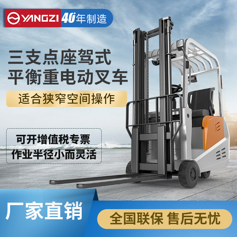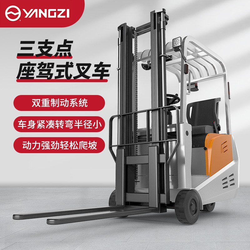 揚子三支點座駕式平衡重電動叉車CPD-A,動力強能耗低免維護低噪音,車身小巧/全車LED警示燈/制動雙保險