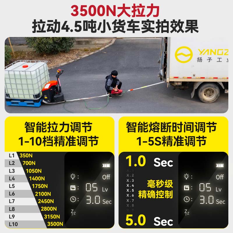 A001智能全自動打包機,3500N強勁大拉力,4000MA特斯拉同款鋰電池,超大按鈕防滑螺紋,操作簡單便捷,人體力學防滑設計,輕松手持不打滑