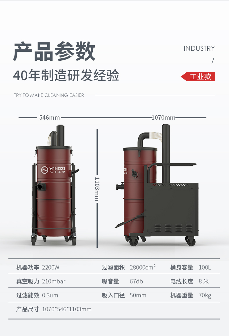 揚子C10工業吸塵器配備2200W純銅線電機;雙通道散熱模式吸力更持久,強勁真空吸力。升級100L工業級大容量塵桶,避免使用過程中出現反復傾倒的情況,創新多重過濾系統,避免使用過程中出現二次污染問題。